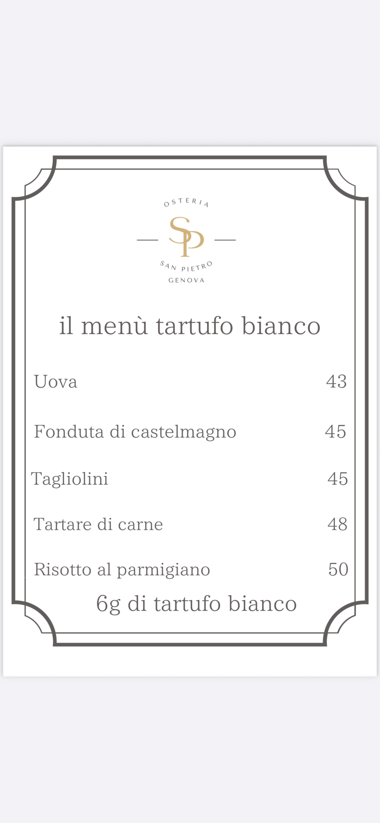 L'Osteria San Pietro è un progetto nato da un idea dello Chef Noriyuki Uchida che, da sempre affascinato dalla cucina e dalla cultura della nostra penisola, è venuto in Italia dal Giappone per apprendere tutti i "segreti" gastronomici della Liguria Dopo quasi sette anni di esperienza maturata con la famiglia Scala,esperti del settore, tra i quali si distingue particolarmente Mamma Teresa, che è riuscita a trasmettere la passione e l'amore per la cucina a tutto lo staff dell'Osteria San Pietro, nasce questo locale, di nuova gestione ma ancora fortemente legato alle idee culinarie di una famiglia che è sempre stata sinonimo di buona cucina a Genova
